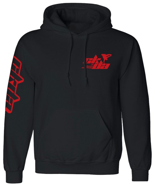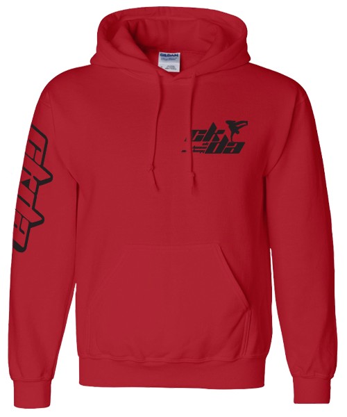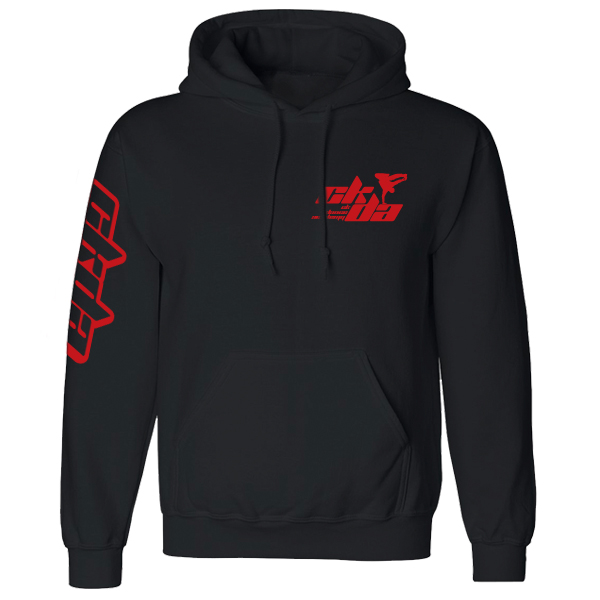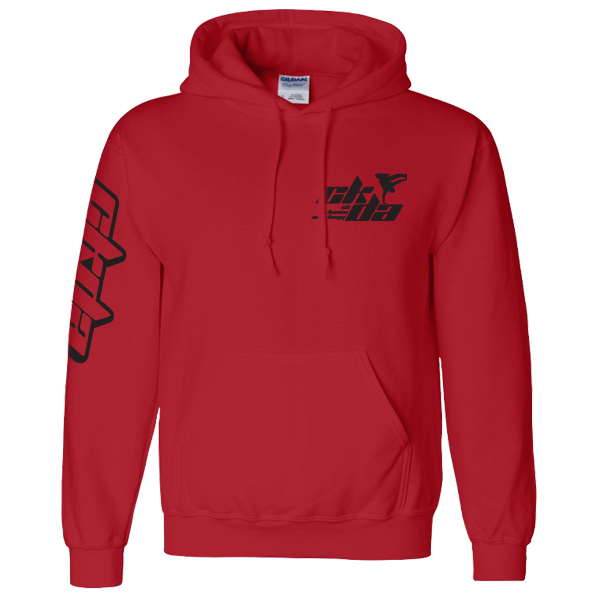 Available on Black or Red , Gildan brand long sleeve and hooded sweatshirt