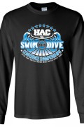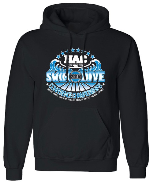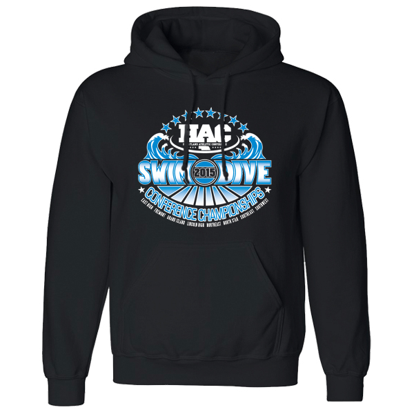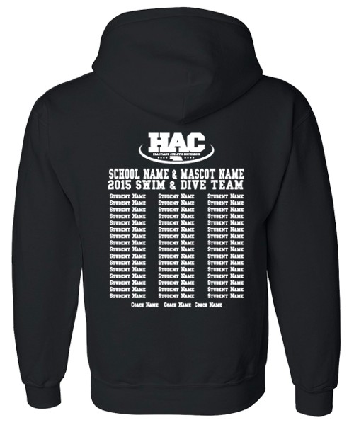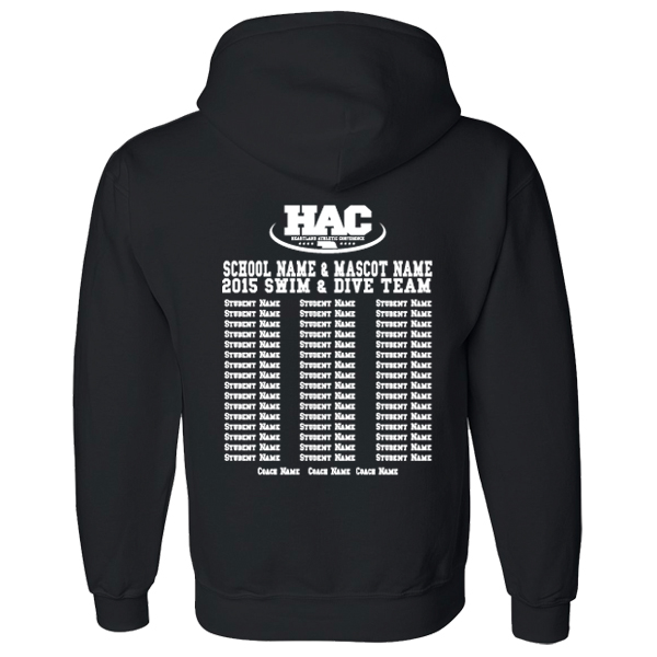 Black. Selected school swim & dive team roster will be printed on the back. Gildan