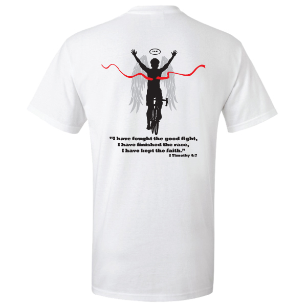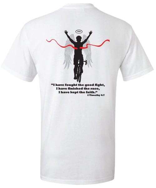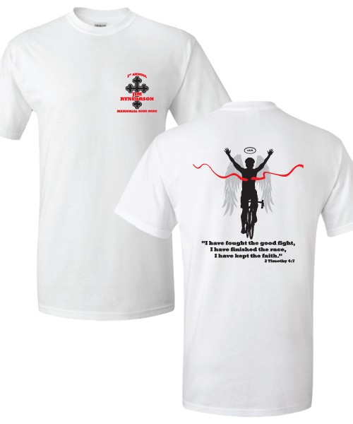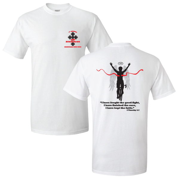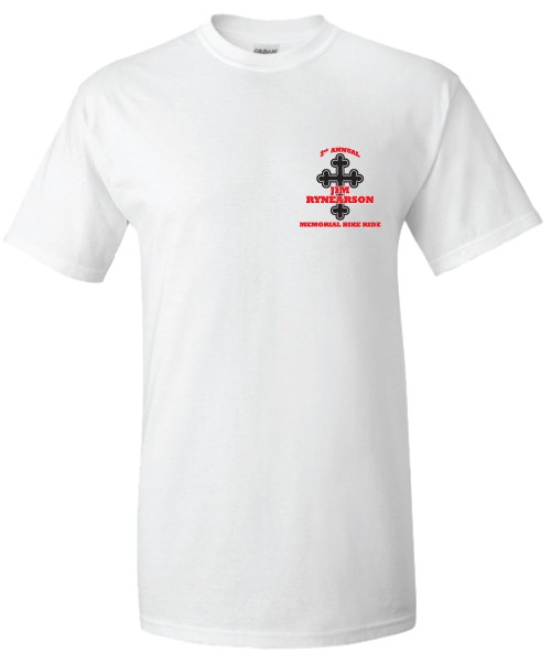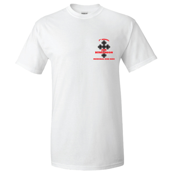 The shirt is a 100% cotton, 6.9 oz., white Gildan brand tee shirt.